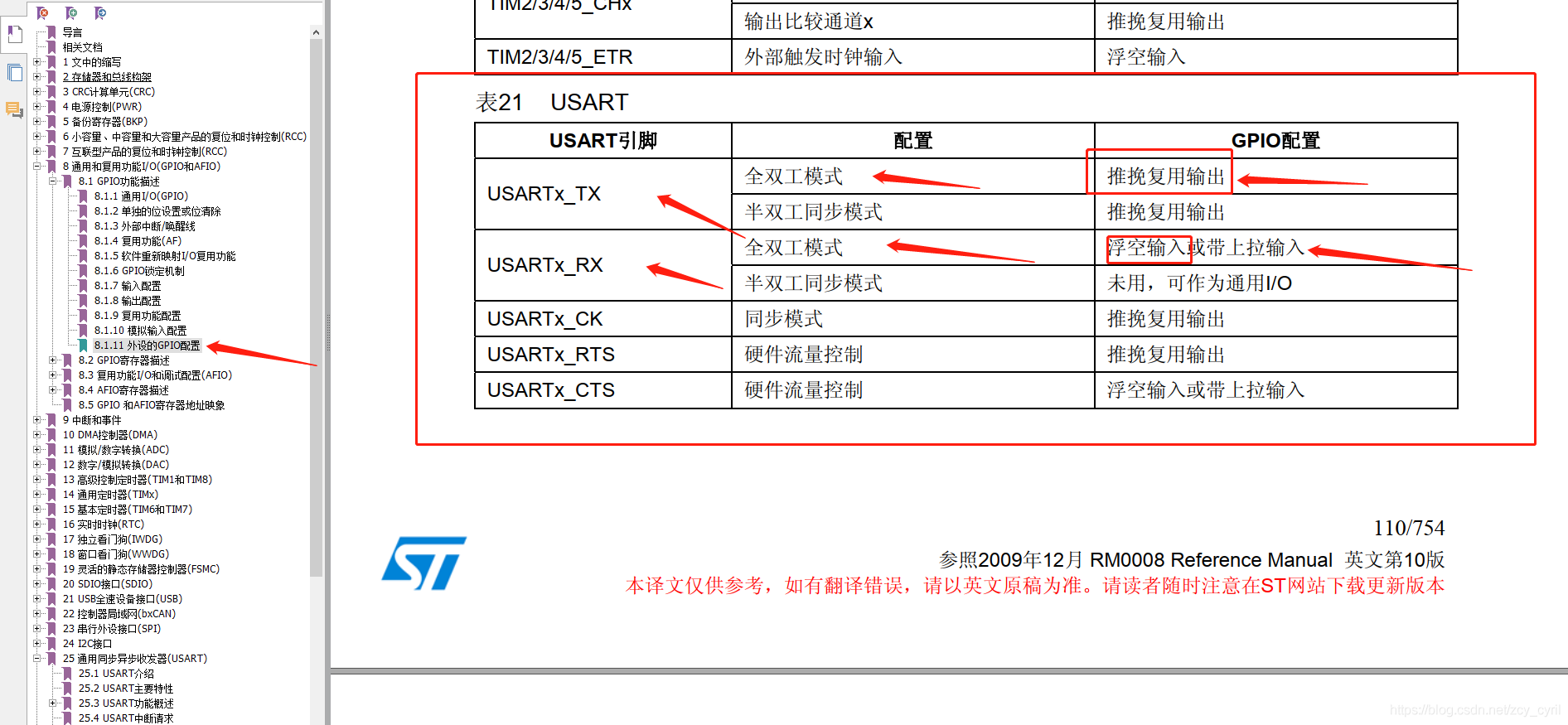 其中串口的接收端模式配置成浮空输入,输出端配置成复用推挽输出,为什么这样配置呢?具体怎么配置可以在参考手册的这里找到