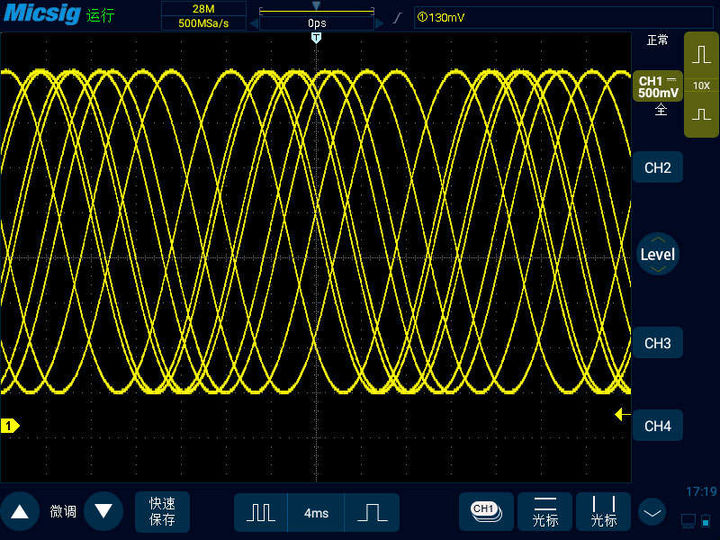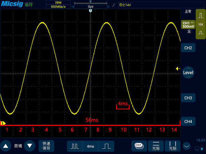 示波器的时基是4ms,代表屏幕横坐标上波形走过一格是4ms的时间,示波器横坐标一共有14格,那么一屏幕就是56ms的波形。