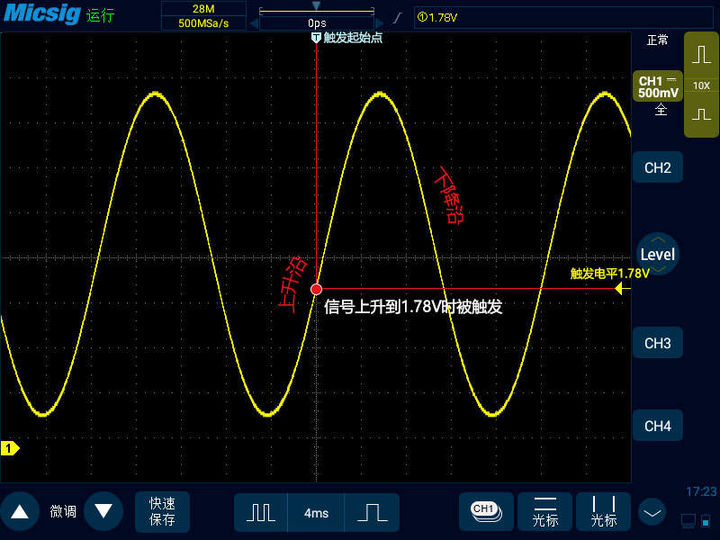 知道了示波器触发的作用,我们来看看示波器触发的原理,也就是示波器是如何做到每次捕获到的波形都几乎一样的。想要波形每次都一样,那么就是要找到波形重复的规律。我们继续观察这个正弦波,这是一个周期性变化的正弦波,它的每个周期都有一个上升沿和下降沿,如果我让示波器每次都从上升沿开始捕捉那就可以重复了吗?还是不行,因为波形上升也是一个过程,想要重复必须找到一个固定起始点,而不是一个片段,在这个波形上升的过程中有无数个点,如果只是定义捕捉上升的正弦波,一样会有无数个起始点。因此捕获的波形必须是满足波形上升到某个固定数值点,这样每次捕获到的点一样且都是上升的过程中,那么波形就是重复的。