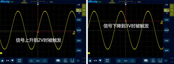 上述这种寻找重复波形的思路是示波器中最常见也是最常用的触发思路,叫做边沿触发。通过调节上升边沿或者下降边沿,来定义示波器触发起始点捕获的是上升中的波形还是下降中的波形。通过调节触发电平,来定义示波器触发起始点的电压是多少。比如我们现在的设置是上升沿,然后触发电平是2V,意味着示波器每次捕获的波形都是当信号上升到2V时开始捕获,这个点为触发起始点。如果我们设置为下降沿,然后触发电平是3V,意味着示波器每次捕获的波形都是当信号下降到3V时开始捕获,这个点为触发起始点。这样,就可以保证示波器每次显示的波形都是重复相近的,也就可以使波形稳定。