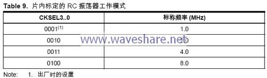标定的片内RC振荡器提供了固定的1.0、2.0、4.0 或8.0 MHz 的时钟。这些频率都是5V、25°C 下的标称数值。这个时钟也可以作为系统时钟,只要按照Table 9 对熔丝位CKSEL进行编程即可。