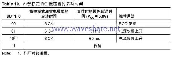 选择了这个振荡器之后,启动时间由熔丝位SUT 确定,如Table 10 所示。XTAL1 和XTAL2 要保持为空(NC)。