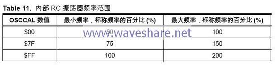 当对其写如不为零的数据时内部振荡器的频率将增长。写入0xFF 即得到最高频率。标定的振荡器用来为访问EEPROM 和Flash 定时。有写EEPROM 和Flash 的操作时不要将频率标定到超过标称频率的10%,否则写操作有可能失败。要注意振荡器只对1.0、2.0、4.0 和8.0 MHz 这四种频率进行了标定,其他频率则无法保证。