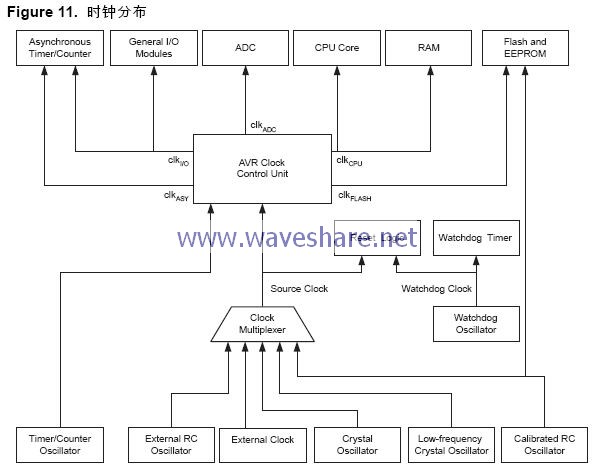 Figure 11为AVR的主要时钟系统及其分布。这些时钟并不需要同时工作。为了降低功耗,可以通过使用不同的睡眠模式来禁止无需工作的模块的时钟,详见P30“ 电源管理及睡眠模式” 。时钟系统详见Figure 11。