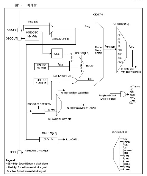 1.图13可见,STM8S单片机主要有四种时钟源可供选择:
