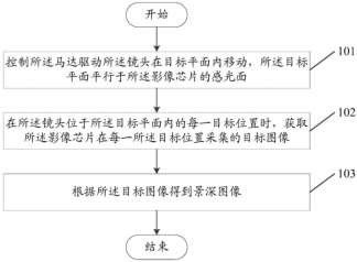 然后在所述镜头位于所述目标平面内的每一目标位置时,获取所述影像芯片在每一所述目标位置采集的目标图像,所述目标位置至少为两个(102)。目标位置中具体的位置和数量可以根据实际需要进行设置,例如,目标位置包括镜头在第一轴向上移动后得到的第一位置和第二位置,或者也包括在第二轴向上移动后得到的第三位置和第四位置。由于控制镜头在平面内沿轴向移动,能够得到两个或者四个目标位置,移动实现方式简单,同时可以降低景深图像的生成难度。