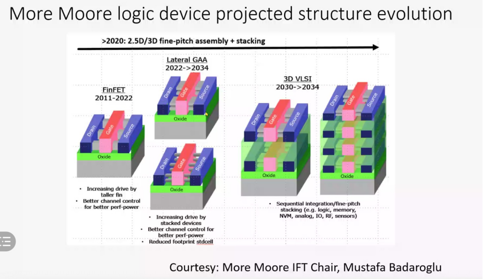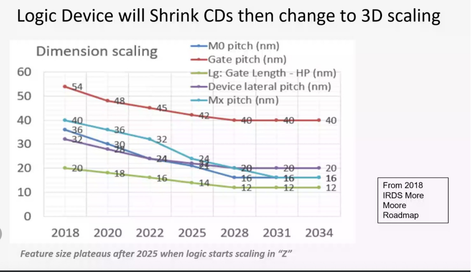 下图预测了未来逻辑器件结构演进方向,从当前的FinFET,到lateral GAA,再到3D VLSI等。逻辑器件从特征尺寸缩微逐步转变到三维缩微。存储器件将是率先发生这一转变的领域,并且闪存技术已经开始三维缩微。