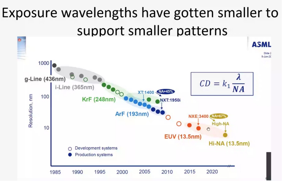 如上图中的光刻公式,决定光刻分辨率的因素有三个:1.选用更小波长(���)的光源,2.通过增大投影入射角及折射率更高的界面材料来提高数值孔径NA值,3.并通过分辨率增强技术以获取更低的工艺因子k1。