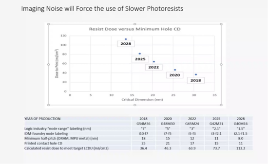 由于成像噪点的原因,不得不降低光刻胶的剂量,但是较低的剂量也意味着更少的光子,以及更高的随机概率。预计在未来两年内吞吐量将下降2.5倍。下图显示了光刻胶剂量和最小通孔直径之间的关系。