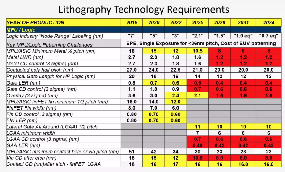 下图列出了2018年开始,7nm制程之后光刻技术的主要尺寸要求。IRDS据此给出了潜在的光刻解决方案选择,以及将面临的关键挑战。