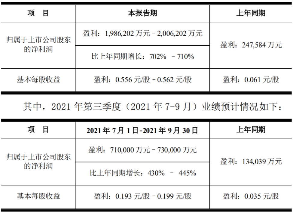 10月7日,京东方A发布业绩预告称,预计2021年前三季度归属于上市公司股东的净利润198.62亿元-200.62亿元,同比增长702%-710%。其中,第三季度归属于上市公司股东的净利润71亿元-73亿元,同比增长430%-445%。
