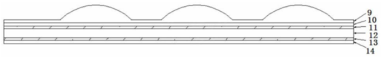 如上图,为这种光学成像结构的叠层图,光学成像结构包括从上至下依次固定设置的微透镜层9、第一透光层、承载层12和第二透光层。其中,第一透光层包括第一遮光层10和第一滤光层11,第二透光层包括第二滤光层13和第二遮光层14。