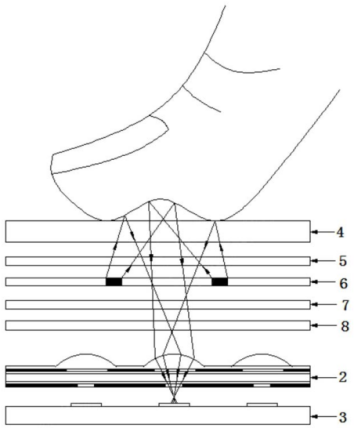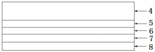 可以看到,该OLED屏幕从上至下依次为玻璃承载层4、空穴传输层5、有机发光层6、电子传输层7和金属阴极8。OLED屏幕都是采用电容式屏幕,通过按压,容值发生变化,处理器会进行判定是否进行自发光。