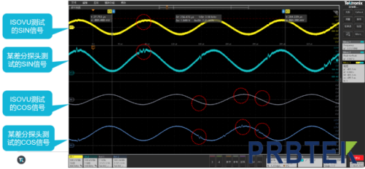 这是利用两种不同探头分别测试SIN和COS信号,从这张图上面大家可以看到C1和R1测到的信号明显要比C2和R2的信号更干净,这是因旋变信号由于其特殊位置导致其很容易受到电机复杂电磁环境的干扰,尤其是共模干扰,因为SIN和COS都是通过差分走线,所以差分的干扰很容易被消除,共模干扰不容易被消除,所以为了能够更真实的观察其共模干扰到底是不是真实存在的,就需要使用共模抑制比更高的探头来进行测试。