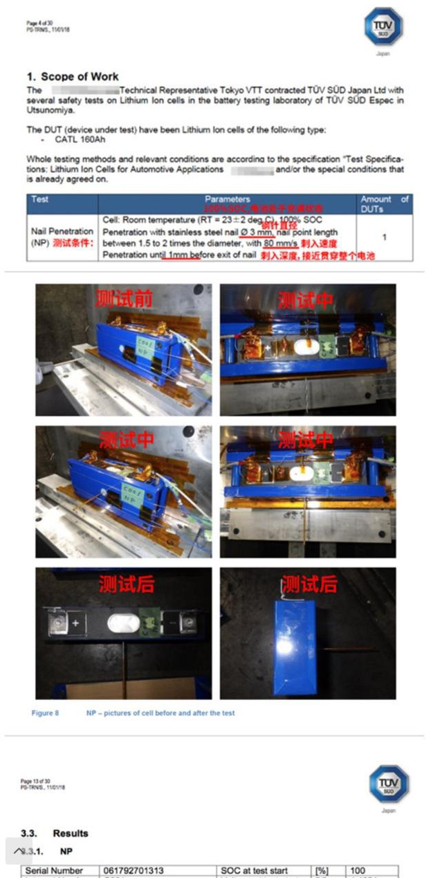 如下所示,这张图是当时在风口浪尖时,C家展示的产品。我觉得这项技术对于未来高镍电芯在长期成本上是否有优势很重要。这个电芯实际做了1mm、5mm和10mm三种不同的针刺深度的实验,结果显示在细针的条件下,都是能过针刺实验的。