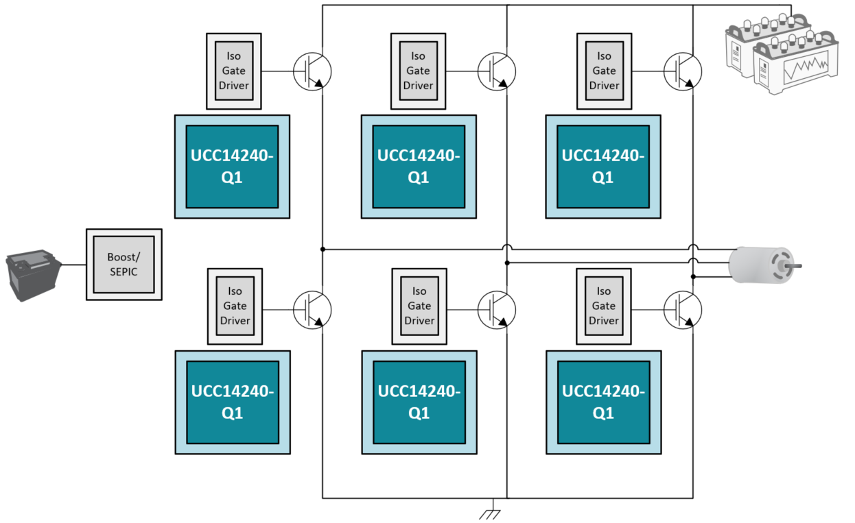 图2:使用UCC14240-Q1的电动/混动汽车牵引逆变器中的分布式架构