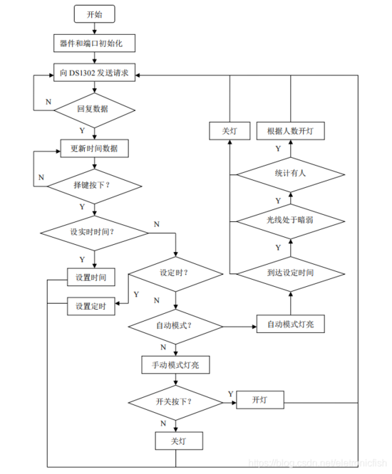 (4)系统分自动/手动模式,可以通过按键切换模式,并有LED指示当前所在模式,在自动模式下,可以设定定时时间段,在定时时间段内,当教室有人(人数大于0)的情况下,如果光线暗弱则自动打开照明灯,照明灯点亮个数根据人数而定,不在定时时间段或者教室无人的情况下,关闭所有照明灯,另外在手动模式下,可以通过手动开关控制照明灯的亮灭,人数统计部分仍然生效。