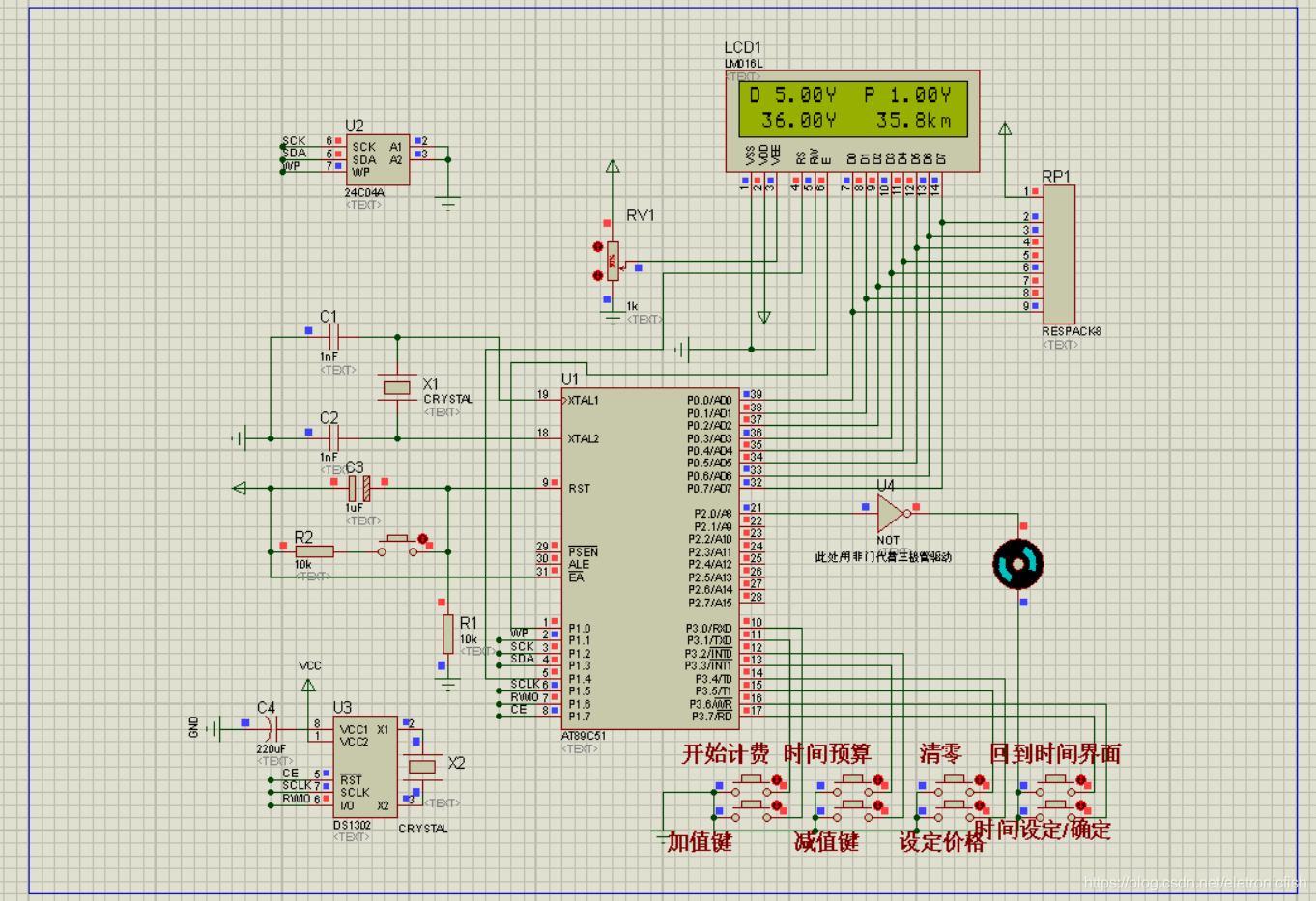 (1)当无乘客时液晶可以显示时间(年月日时分秒),时间可以按键设置,此时电机不工作;当有乘客时电机工作,可以通过按键开始计费系统工作;