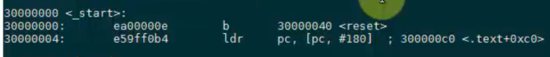 我们要在start.S的前面增加跳转到相应异常向量表的代码,并且要增加代码,当发生未定义指令异常时候跳转到该代码块进行保存现场、处理未定义异常以及恢复现场的工作,然后在下面故意写一条不能被识别的指令。