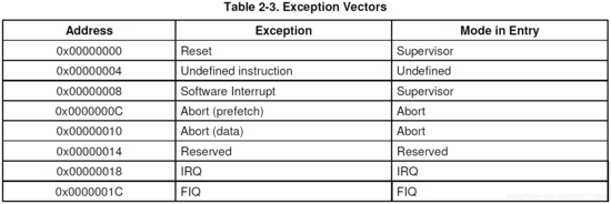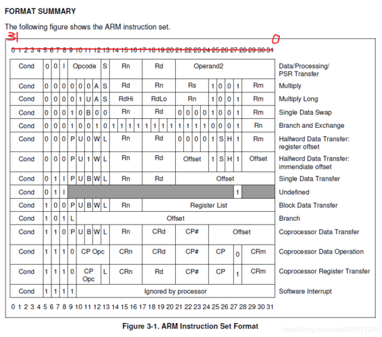 我们看一下2440的芯片手册,找到ARM指令集,只要是下表中的指令都是合法的指令。我们需要定义一条下表中不支持的非法指令,或者直接用0xdeadc0de表示一条未定义指令。