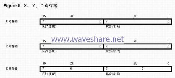 寄存器R26..R31 除了用作通用寄存器外,还可以作为数据间接寻址用的地址指针。这三个间接寻址寄存器示于Figure 5。