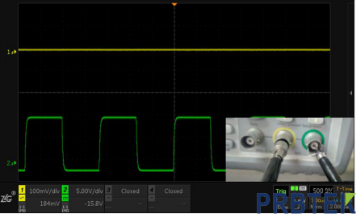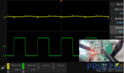 测试原理:通道1测量小信号(100mv/div),通道2测量大信号(5V/div),观察信号互相影响的情况。