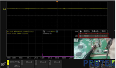 注:通道1信号幅度虽然非常小,但通过FFT分析还是可以定位出600K频点的干扰。