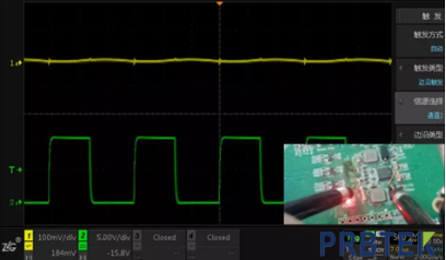 图3 CH1使用夹子测量电源输出,CH2使用夹子测量电感,单点接地