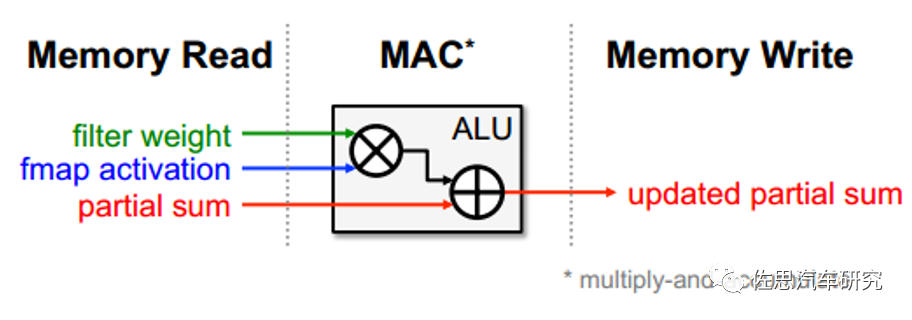 AI芯片的核心就是MAC运算单元,流程就是从内存中读取训练好的模型的滤波权重值和输入数据,两者相乘,然后重复这个流程并将乘积累加,再写入内存。