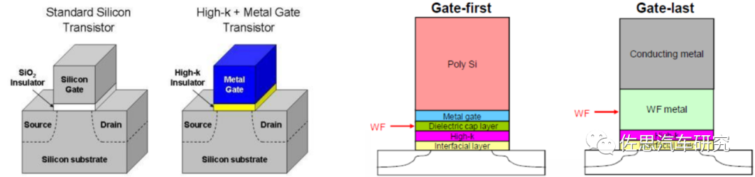 而且随着CMOS工艺的演进,栅氧厚度也要不断缩小。薄到一定厚度的栅氧就不再是理想的绝缘体,会出现明显的泄漏。在40nm进入28nm的时候,业界开始普遍采用HKMG技术。技术路线分为Gate-first和Gate-last。