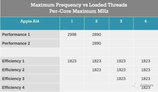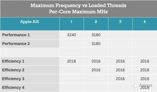 与A14相比,新的A15将两个性能核的单核频率峰值提高了8%,达到了3240MHz,而上一代的频率为2998MHz。当两个性能核都处于活动状态时,它们的工作频率实际上提升了10%,与上一代的2890MHz相比,现在都以3180MHz运行。