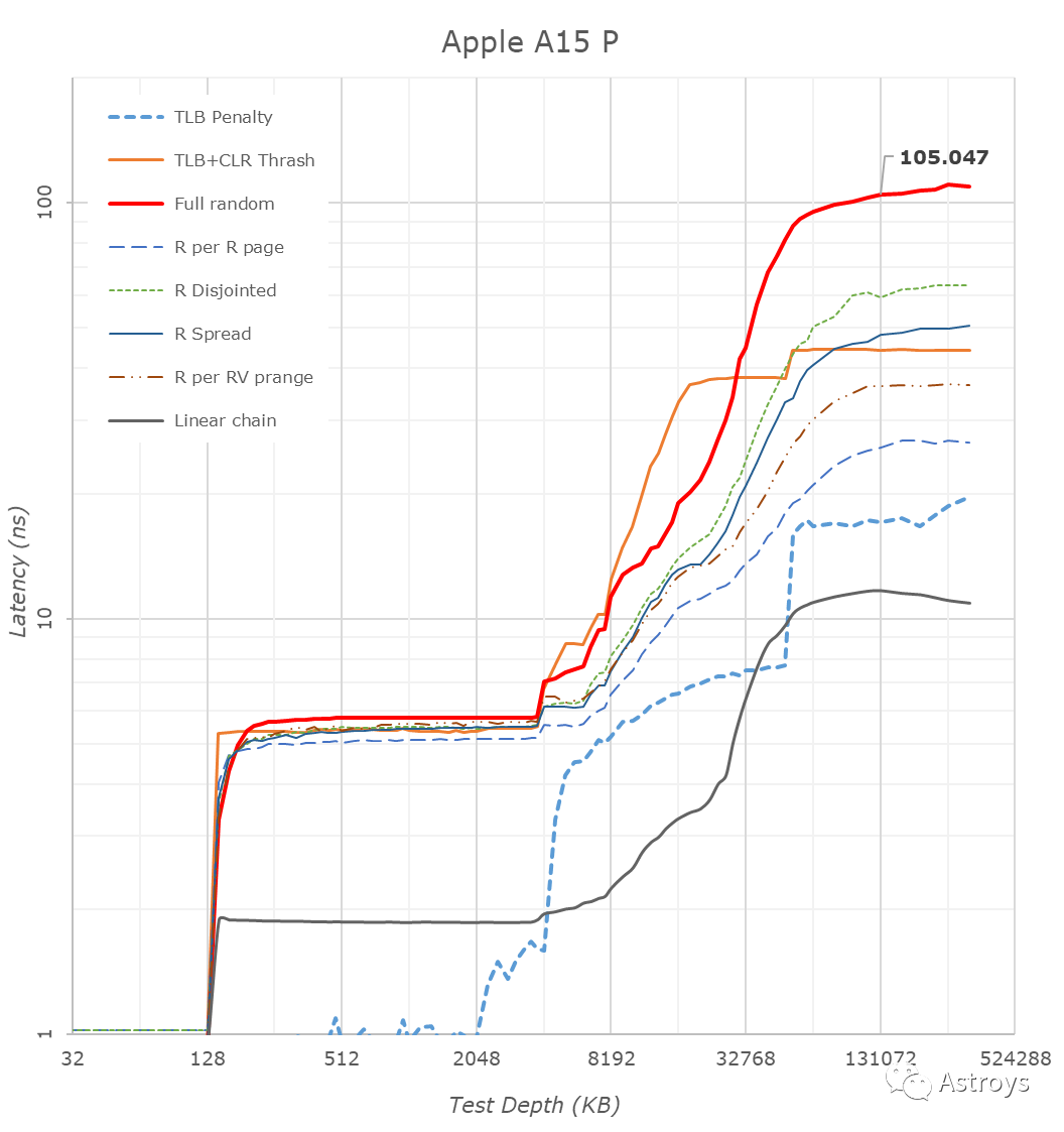 今年的能效核似乎没有改变cache的大小,仍然是64KB的L1D和4MB的共享L2,但我们看到Apple已经将L2 TLB(Translation Look-aside Buffer)增加到2048项,现在覆盖了32MB,可能是为了优化SLC访问延迟。有趣的是,Apple今年让能效核有更快的DRAM访问,现在的延迟约为130ns,而A14的延迟为+215ns。