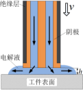 试验所选取的零件如图1所示,深径比为12:1,异形孔入口处为平面,出口处为半通半盲孔。电解加工过程中,工具阴极接电源负极,工件接电源正极,工具阴极以一定速度向下进给,电解液高速流过工具阴极与工件形成的加工间隙,带走加工产物及焦耳热,工件一侧发生电化学溶解,实现工件加工成形,工具阴极外侧涂覆绝缘层以防止加工过的孔壁发生二次电解。
