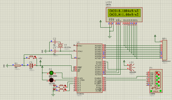 主要由51单片机甲醛浓度报警器采用51单片机+ZE08-CH2O甲醛浓度传感器+LCD1602液晶显示+LED灯+按键+蜂鸣器设计而成;如图: