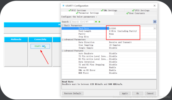 例如:115200bps、指每秒传送115200位。通信双方必须设置同样的同学速率才能正常通信