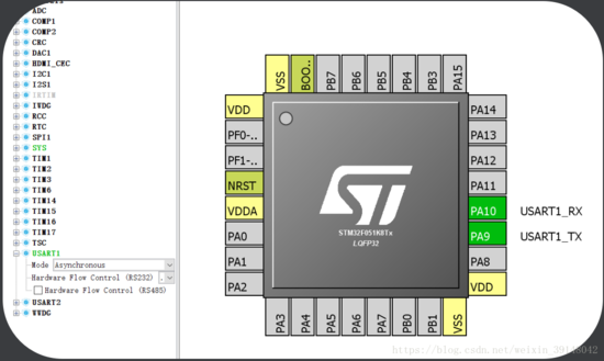 STM32f051串口:STM32F051内置多达两个通用同步 / 异步收发器( USART1 和 USART2 ),通信速度可达 6 Mbit / s