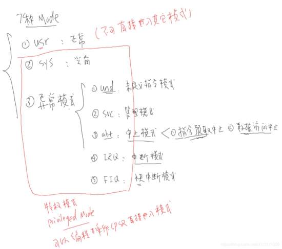 ARM CPU有七种模式,各种模式如下图所示。注意用户模式下不可进入其他模式,用户模式是在有操作系统的时候给应用程序使用的,写应用程序的人水平千差万别,不能保证写的程序是好是坏,所以让应用程序运行在用户模式,限制应用程序的权限,防止破坏整个系统,