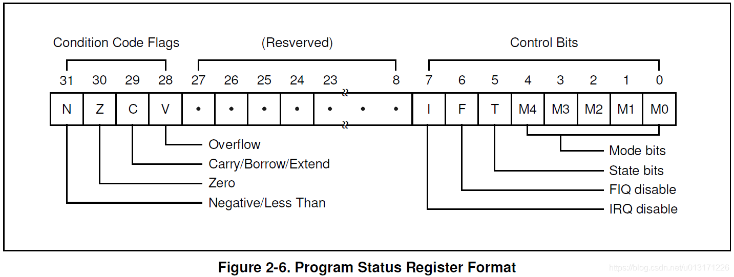 下面我们看一下程序状态寄存器,CPSR当前程序状态寄存器,SPSR(saved)保存的程序状态寄存器,用来保存被中断模式的CPSR,低位的M4-M0表示当前CPU处于哪种模式,然后T表示CPU工作与ARM State还是Thumb state,F表示FIQ disable,当该位为1时,所有的FIQ是禁止的。bit28-31是状态位,比如当我们执行cmp R0,R1 beq xx.如果R0=R1,那么状态位的Zero位就是1,然后beq指令会来判断Zero位是否为1,为1则跳转。
