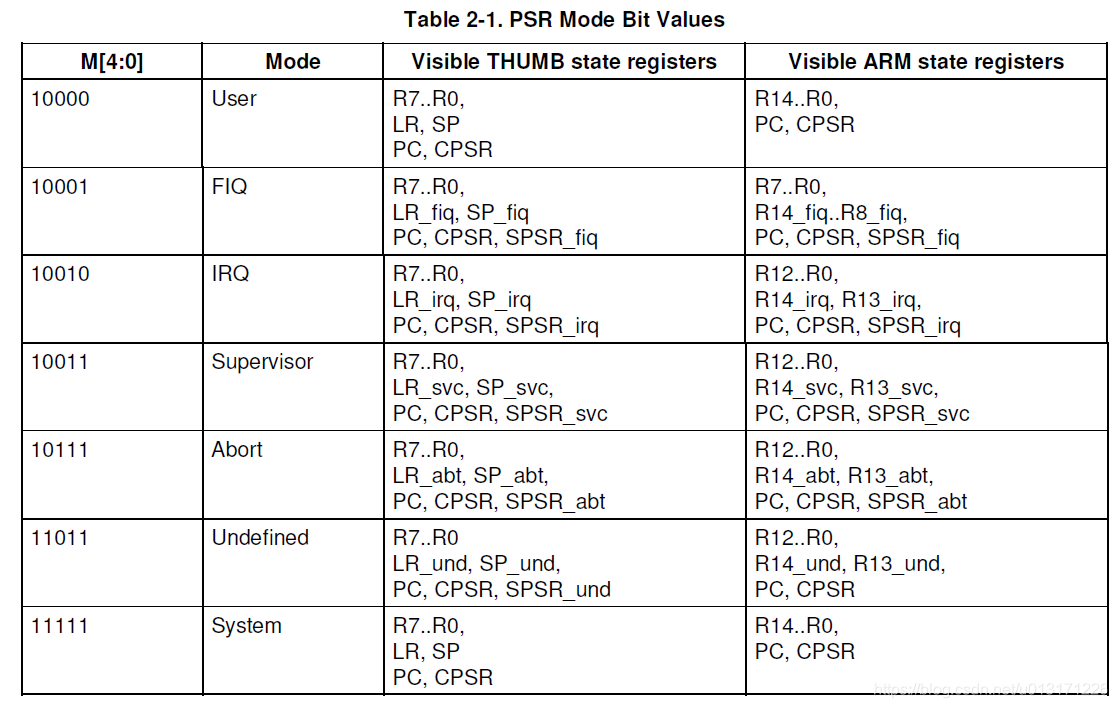 每种异常模式主要差别就在于寄存器的差别,