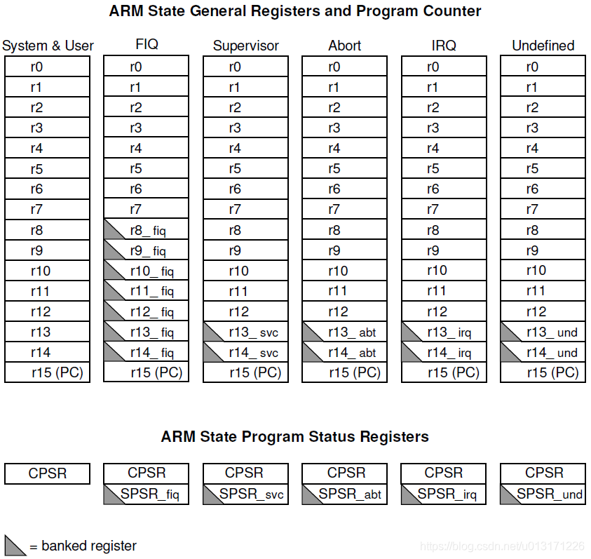 我们可以看到在所有的7种模式下我们都可以使用r0-r15.但是有些寄存器画有灰色三角形,这表明在该模式下面访问到这些寄存器的时候,访问到的是这个模式下专属的寄存器,比如在FIQ模式下,我们访问R8的时候,访问的是FIQ模式下它专属R8寄存器,这时候访问到的R8和用户模式下访问到的R8寄存器不是同一个物理寄存器,我们可以看到在后面的5种模式下,R13,R14都是专用寄存器,其中R13用作栈,R14用作LR返回地址,也就是每种异常模式下我们可以分别设置它的栈,然后LR用来保存发生异常时的指令地址。