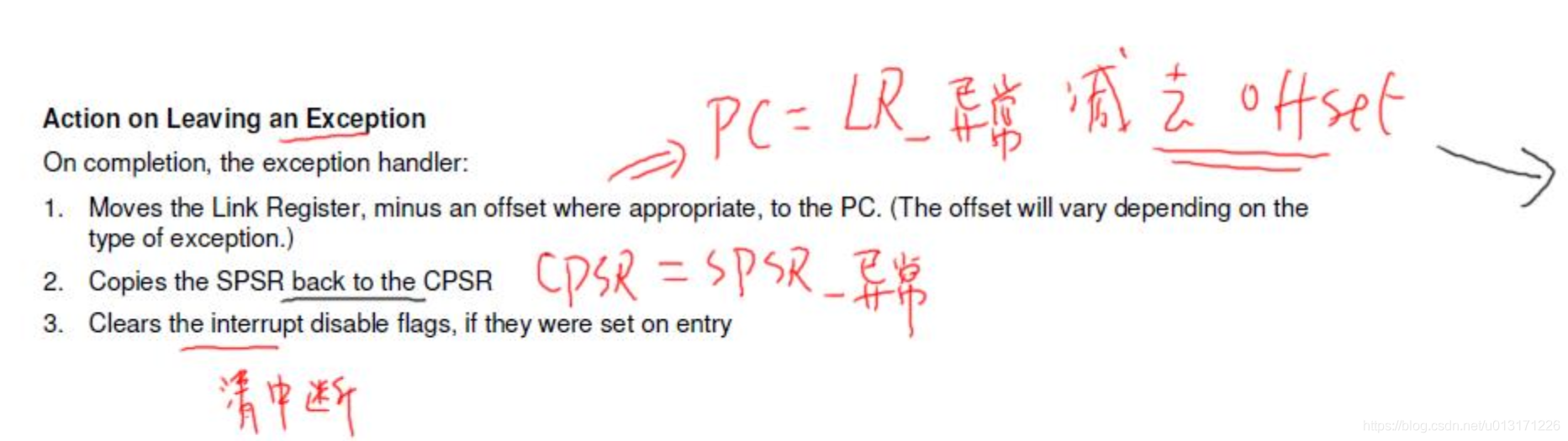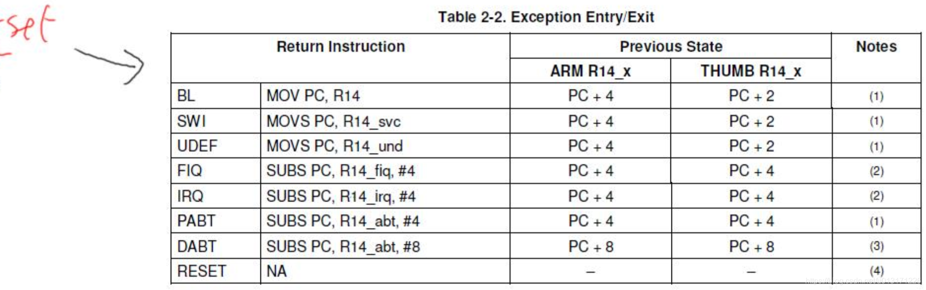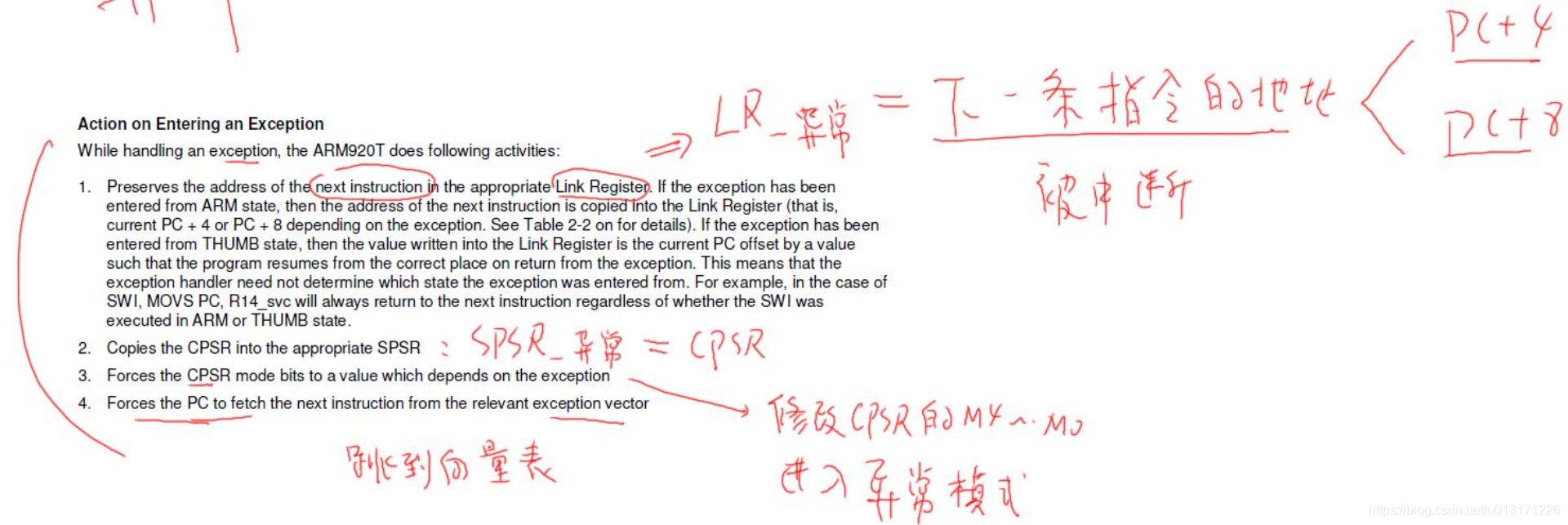 发生异常时我们的CPU首先把被中断的下一条指令的地址保存到LR寄存器里面,有可能是PC+4,有可能是PC+8,到底是哪个值取决于不同的情况。