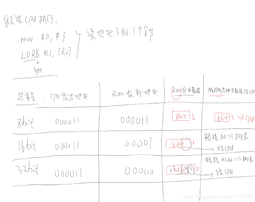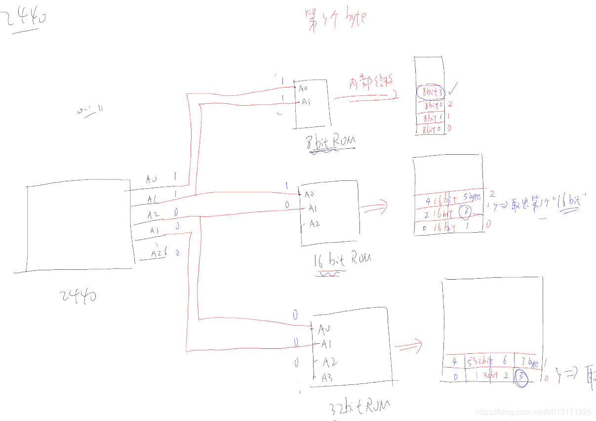 当我们外部接的是8bit的rom时,我们cpu的A0就连接rom的A0,外接的是16bit的rom时,我们cpu的A1连接rom的A0,外接的是32bit的rom时,cpu的A2连接rom的A0,具体如下