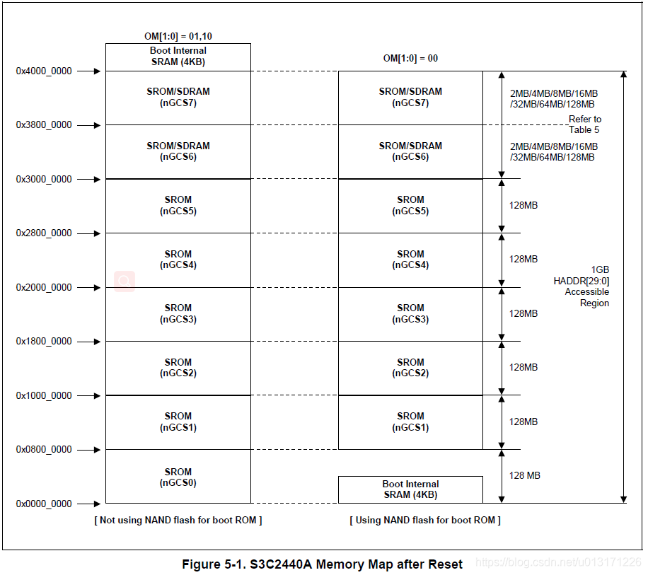 内存接口:对于内存设备来说,CPU发出的地址可以直接传给内存类设备,内存类设备包括norfalsh, 网卡,SDRAM,但是nandflash不属于内存类设备,对于内存类设备,我们cpu的数据总线和地址总线都是直接连接到内存类设备上的,然后我们的norfalsh,网卡,以及SDRAM是公用地址总线和数据总线的,我们需要用片选引脚来保证三个内存类设备在共用地址总线和数据总线的时候互不干扰, 当cpu发出地址时,内存控制器根据不同的地址范围产生不同的片选信号,从而选择不同的内存类设备,不同地址范围对应的片选引脚如下图所示,每一个片选信号可以选择的地址空间是128M。128M=2的27次方,至少需要A0 .... A2627根地址线,但是我们一直都说我们的CPU是32位的,为什么我们只用到了27条地址线,因为我们的cpu会把32位的地址发给内存控制器,但是我们的内存控制器只使用了其中的27位。