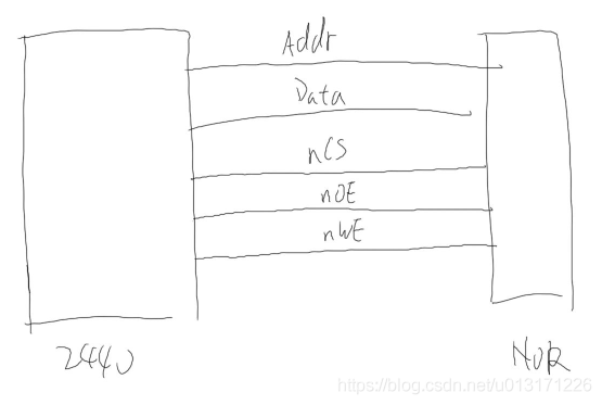 我们以norfalsh为例子讲解时序图,首先我们的cpu和norfalsh主要连接有地址线、数据线、片选信号、读信号、写信号。