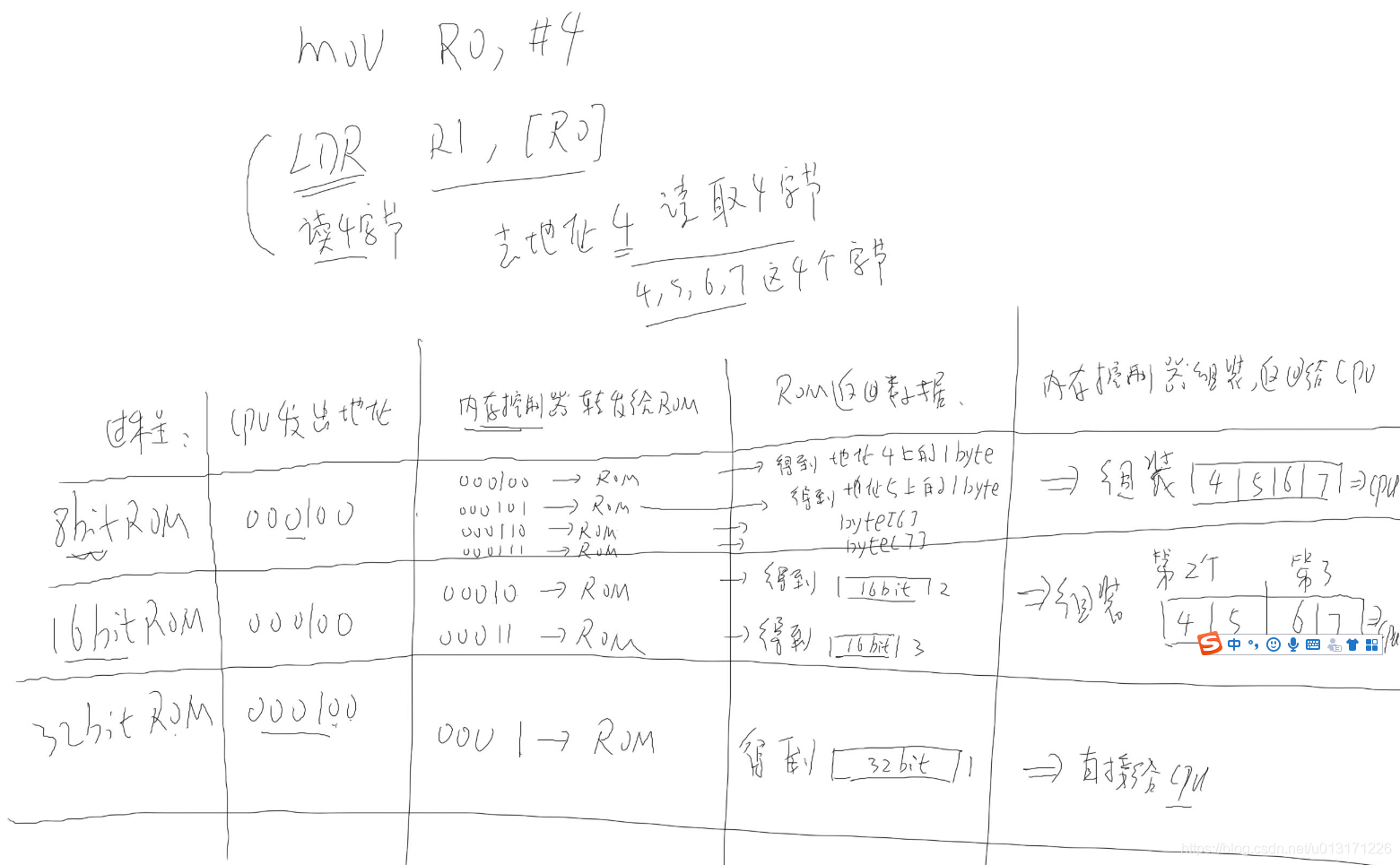 当cpu从rom读取数据时,CPU发出地质,然后rom收到地址,然后rom把数据发送给内存控制器,然后对于16bit和32bit的rom,内存控制器会从中挑出数据返回给cpu,具体如下图所示。