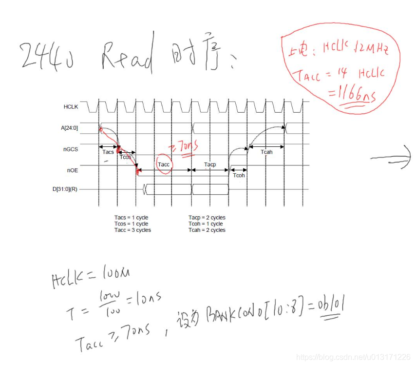 假设HCLK是100M,那么时钟周期是10ns,那么我们设置Tacc是8个时钟即可。