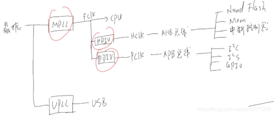 晶振经过MPLL,得到FCLK提供给CPU,然后FCLK经过HDIV分频可以得到HCLK提供给AHB总线,经过PDIV得到PCLK提供给APB总线。