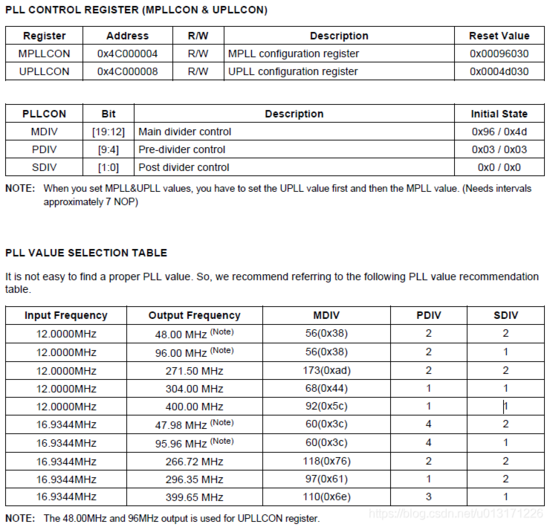 我们的S3C2440硬件电路板上,时钟源是一个12M的晶振,我们用PLL锁相环可以得到上面的三种频率。