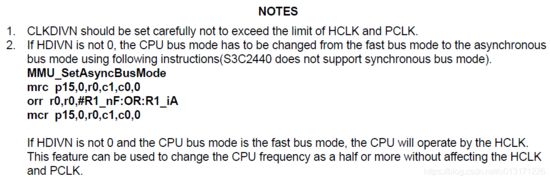另外,芯片手册里面有一个注意事项,如果我们的HDIVN不是零的话,CPU总线必须设置为异步模式,否则CPU会使用HCLK而不是FCLK.所以我们要设置CPU为异步模式。