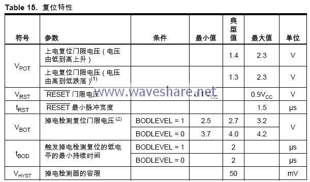 2. 一些器件的VBOT 可能比标称的最小工作电压还要低。这些器件在生产测试过程中进行了VCC = VBOT 的测试,保证在VCC 下降到处理器无法正常工作之前产生掉电检测复位。ATmega16L 的测试条件为BODLEVEL=1, ATmega16 的测试条件为BODLEVEL=0。BODLEVEL=1 不适用于ATmega16。